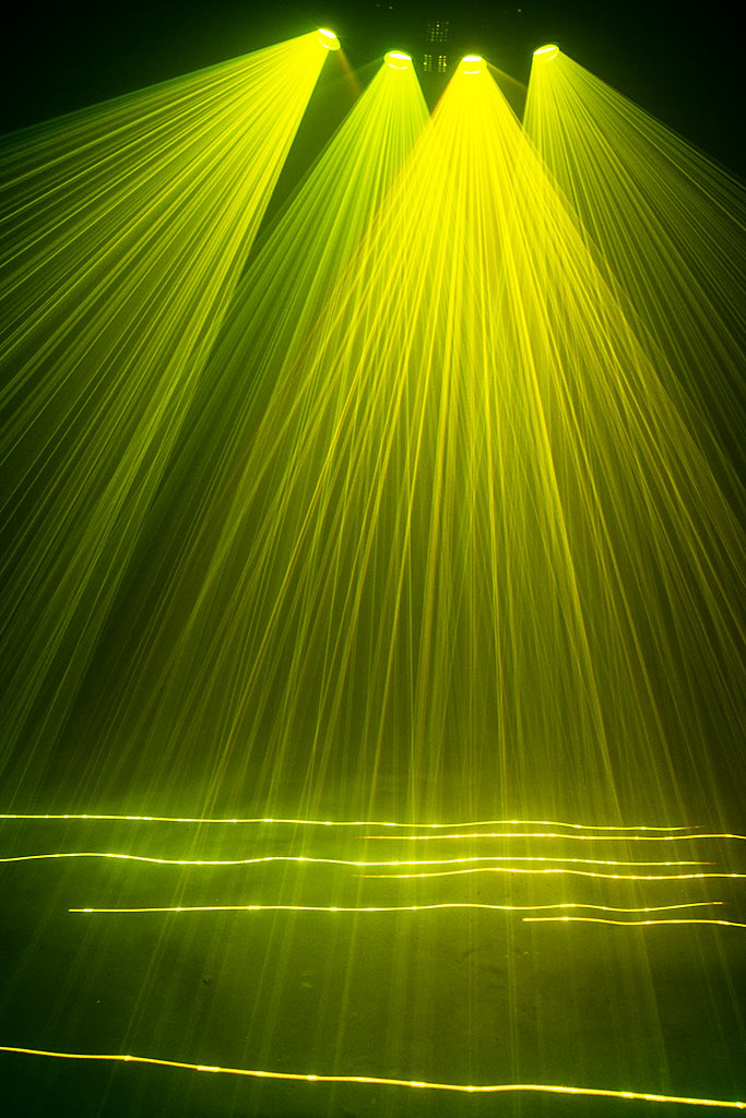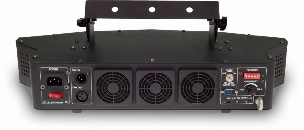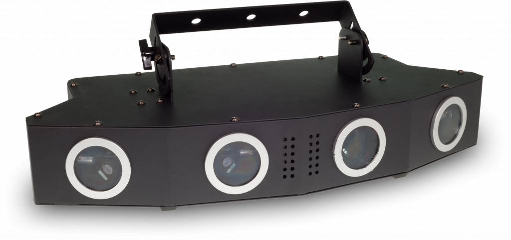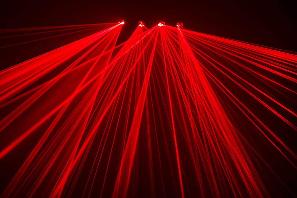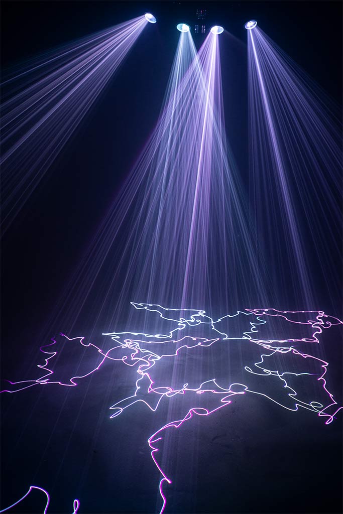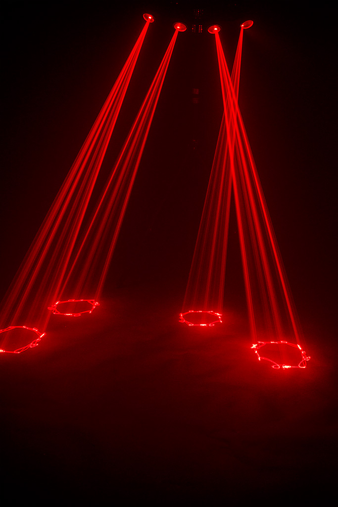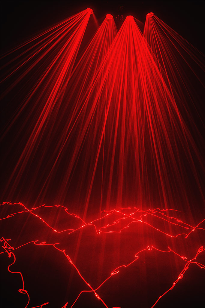 Many of the built-in patterns have been programmed in a way that the four laser outlets play well together and fill the whole room, like a multi unit laser show. The curved shape of the unit allows for a very large horizontal deflection angle, so the laser can cover the whole room.