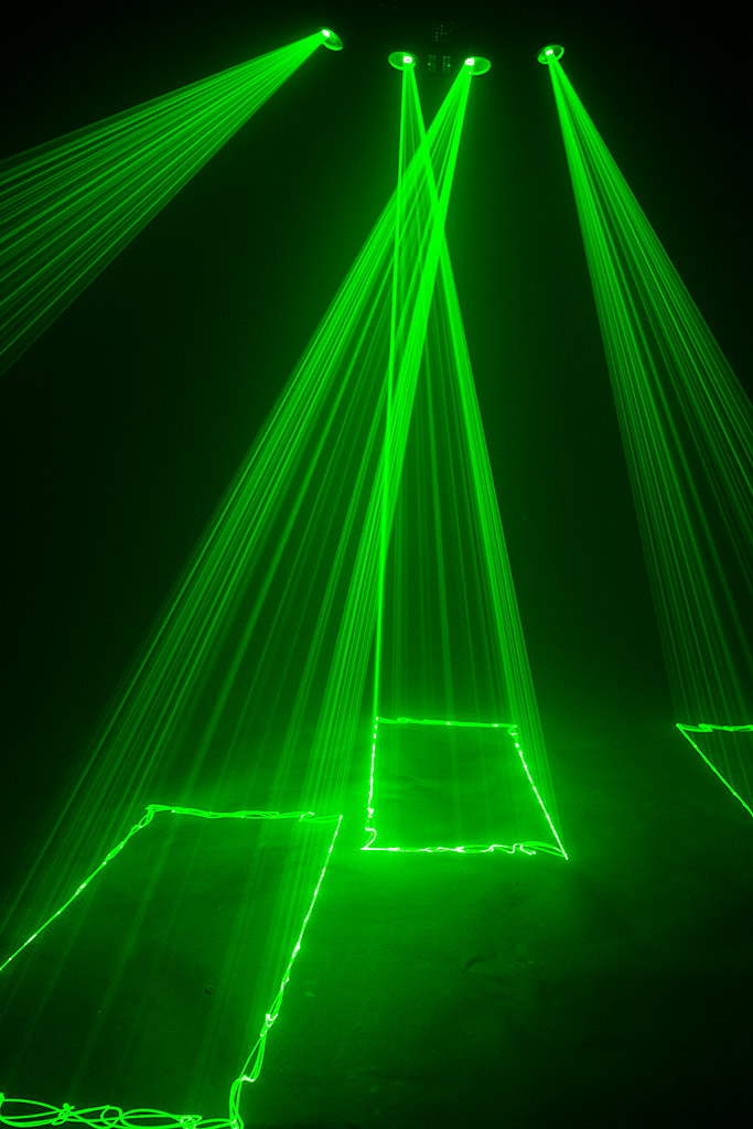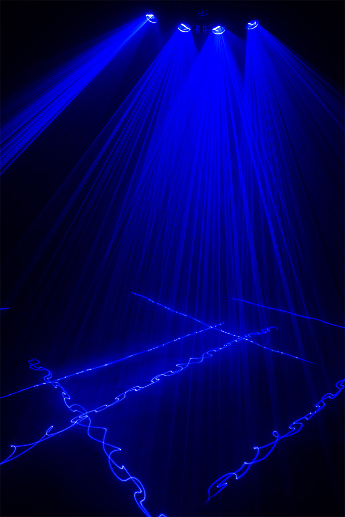 The red diode laser module with a wavelength of 650nm, the green DPSS laser module with a wavelength of 532nm and the royal-blue laser module with a wavelength of 450nm ensure beautiful colors and bright beams. The beam has ca. 3 mm diameter at aperture and a divergence of about 2 mrad. About ca. 50 (layers, tunnels, fences, waves, etc.) are included. Many of them do not output all the same way on all four laser outlets, but some of the x-axis mirrored or modified in a way, that the laser display looks nice and homogenous.